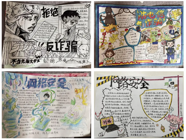 手抄报创作中,同学们充分发挥创意,以多彩版面搭建知识框架:有的用红黄颜色调绘制钓鱼邮件、恶意弹窗等风险场景插画,以清新蓝绿搭配文字标注识别技巧;有的则以告示栏形式串联网络安全发展历程,穿插手写体心得与卡通安全卫士形象,将观影中习得的密码设置、隐私保护等知识转化为图文并茂的实用内容,字里行间满是对安全细节的思考。